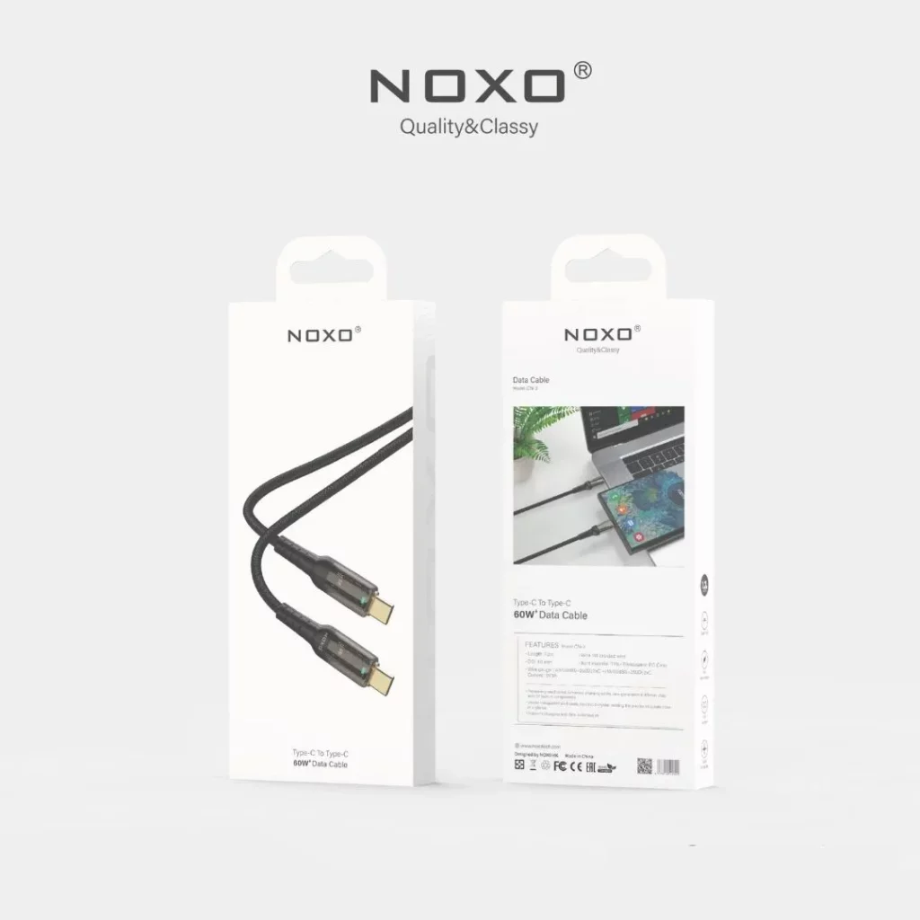 کابل Type-C به Type-C نوکسو مدل CN-3 با طول ۱.۲ متر، بدنه ترکیبی TPE و شفاف، طراحی مقاوم و پشتیبانی از شارژ سریع تا ۳۰ وات و انتقال داده ایمن، گزینهای حرفهای و قابل اعتماد برای دستگاههای USB-C است.